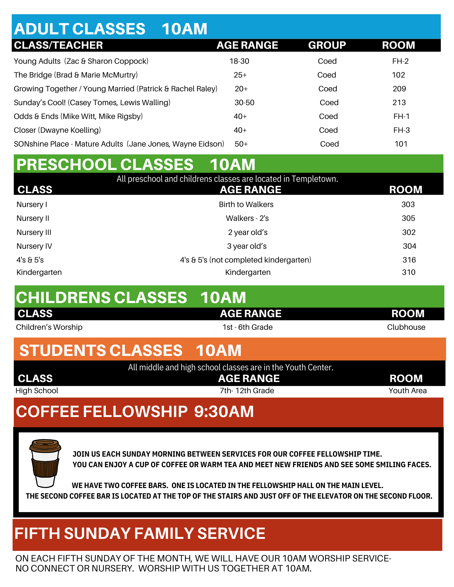 Our Connect Classes are offered at 8:30AM & 10AM. We have two Coffee Bars that are open from 9:30-10AM. This gives everyone an opportunity to grab a quick coffee and meet new friends before our second hour of Worship & Connect at 10AM.